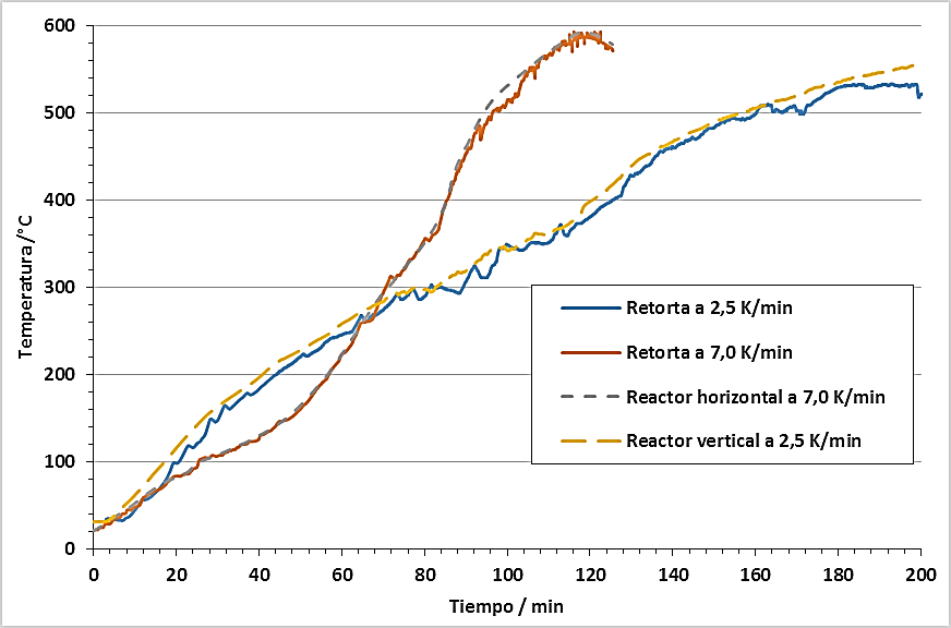 Los perfiles de temperatura de las diferentes pruebas se observan en la Figura 4. Los perfiles de temperatura indican que fue posible reproducir el perfil térmico de los reactores en la retorta satisfactoriamente. A partir de 150 °C se observa una tasa de calentamiento aproximadamente constante para los dos reactores, por lo que para cada perfil se calcula mediante regresión lineal a partir de esta temperatura. La tasas calculadas corresponden a 2,5 K/min y 7,0 K/min.