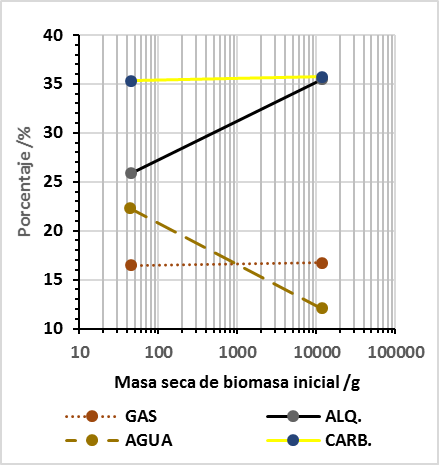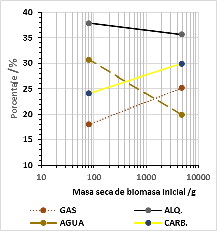 En la Figura 5(a) se observa una alta influencia de las reacciones secundarias al escalar el proceso a nivel de la retorta de 0,16 l al nivel de reactor de lecho fijo horizontal de 38,20 l. En la figura se observa un aumento en la producción de carbonizado y de gas con un aumento en la masa inicial que se atribuyen a reacciones de recondensación de alquitranes y de craqueo respectivamente. Estas reacciones ocasionan que la fase líquida compuesta por alquitranes y agua disminuya. Los gradientes de temperatura en el lecho ocasionan que la biomasa reaccione inicialmente en la superficie y de manera progresiva en el interior de las partículas, a medida que incrementa la temperatura. De esta forma la fracción volátil proveniente del interior de la partícula cruza una capa de material ya carbonizado de la misma o de otra partícula y con una temperatura mayor, lo que promueve las reacciones secundarias. Las reacciones de craqueo se llevan a cabo principalmente por medio de craqueo térmico, reformado de vapor y reformado en seco de acuerdo a las ecuaciones (3), (4) y (5) (El-Rub, 2008) . La disminución en la fracción de agua se puede deber a que la reacción de reformado de vapor, representada en la ecuación (4), se favorece en el proceso.