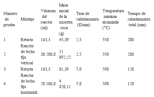 Se llevan a cabo cuatro pruebas experimentales de pirólisis de cuesco de palma de aceite en tres montajes en operación en lote. Las condiciones experimentales de las pruebas se observan en la Tabla 1.