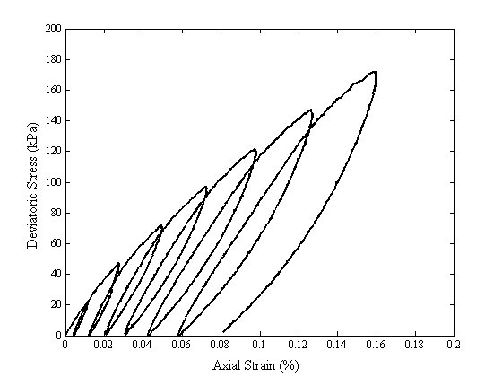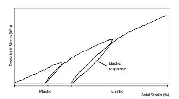 This is the typical response of a granular base in a pavement structure. After unloading, the irrecoverable or permanent deformation is the plastic strain and it could be considered as a new reference state, where the elastic response can be measured since the failure is not achieved (Wood, 1991).