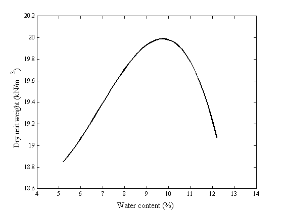 own workThe parameters of optimum water content and maximum dry unit weight are 9.6% and 1.96 g/cm3, respectively. The curve of compaction is presented in Figure 3.