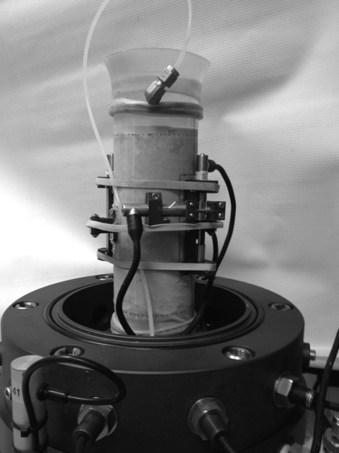 A GDS triaxial equipment, able to generate stress path automatically, was used to estimate the stress-strain behaviour of the granular base during load-unload-reload stages. The device is equipped with an 8 kN submersible load cell, three pressure/volume controllers of 0.1 kPa and 1 mm3 of precision, and LVDT type local transducers (Figure 4) capable to measure directly axial and radial strains of the specimen.