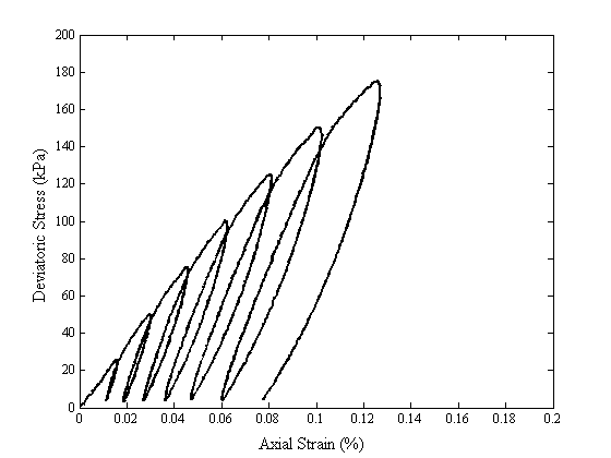 Jafarzadeh and Sadeghi, Jafarzadeh & Sadeghi (2012), studied the variation of dynamic properties of sands depending on the degree of saturation. They showed that the shear modulus is almost constant for a wide range of saturation, but it reduces considerably as the full saturation is reached. Similar results were found by Lu & Kaya (2014). To Boscardin, Selig, Lin, & Yang (1990) and Zhang, Li, & Chen (2013) the hyperbolic model is useful to compute elastic moduli and strains during loading process.