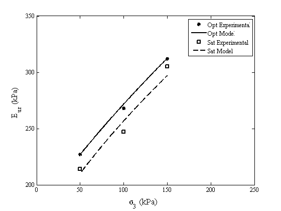 (4)Replacing s3 in equations 3 and 4 for the value of atmospheric pressure, was found that Eur has a variation of 1% and 4% comparing with the results showed in Table 5 for a confining pressure of 100 kPa in both water conditions. Figure 8 presents the numerical adjust between experimental data with model results.