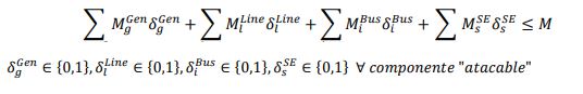 (32) (33) (34) (35) (36) (37) (38) (39) Las ecuaciones (33) a (37) tienen respectivamente los siguientes propósitos: atacar un generador o el nodo al cual está conectado, pero no ambos; atacar una línea o el nodo al cual está conectada, pero no ambos; si las líneas están en paralelo, atacar una pero no ambas; atacar un nodo o su subestación, pero no ambos; atacar una línea o la subestación a la cual está conectada, pero no ambos. Dado que en la nueva metodología se considera el caso de generadores conectados directamente a las subestaciones, se adicionó la restricción (38), en la cual se ataca la subestación o el generador, pero no ambos. La solución del Problema Principal se expresa como y se utiliza en el subproblema para iniciar una nueva iteración del algoritmo.