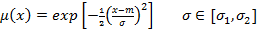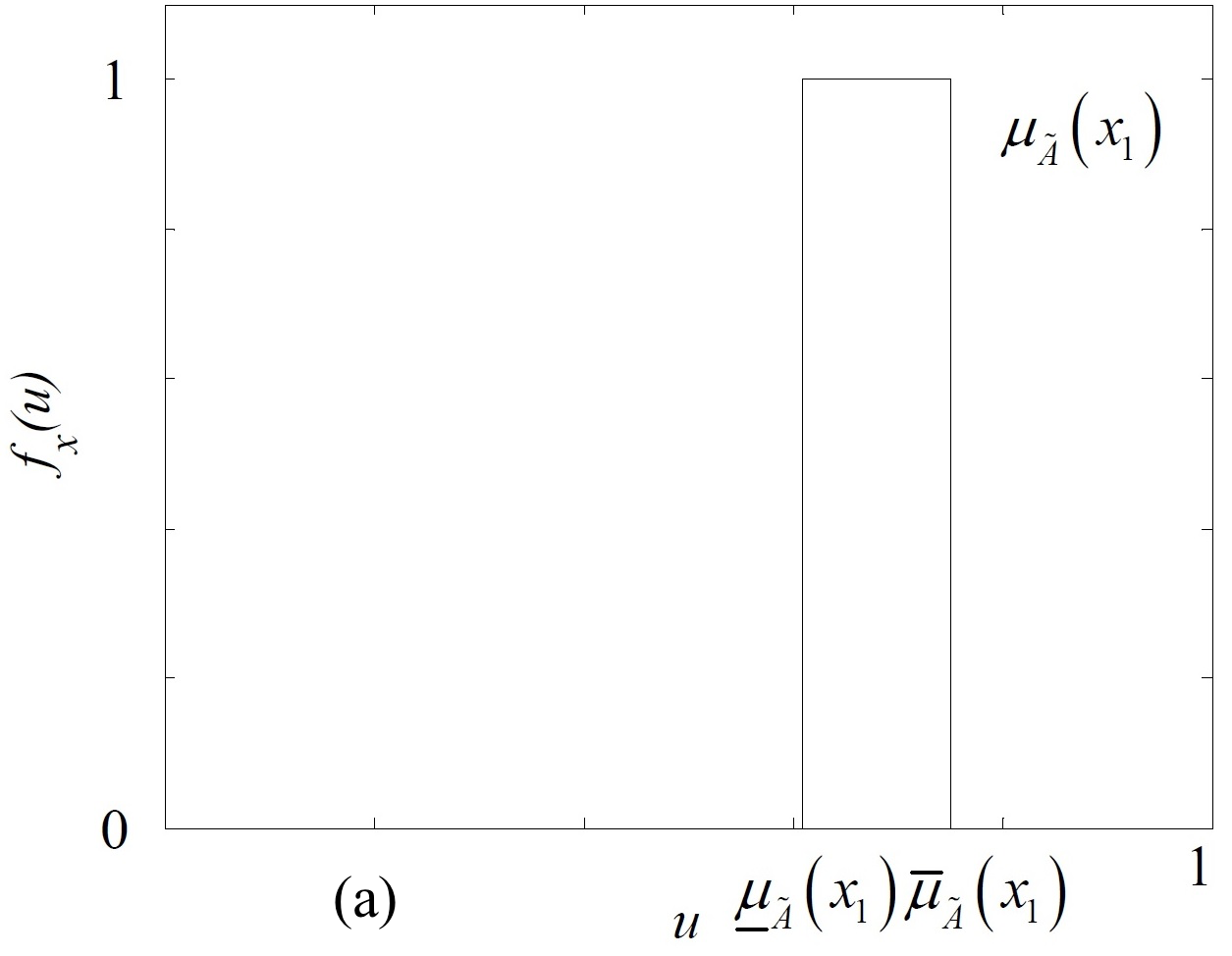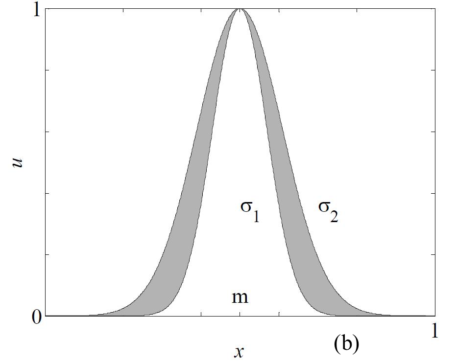 Para implementar los T2FLS, en este trabajo se utilizan funciones de pertenencia secundaria (FPS) de Intervalo (Figura 3a), dado que computacionalmente son menos complejas. Para determinar la huella de incertidumbre (FOU Footprint Of Uncertainty) de las funciones gaussianas con desviación estándar σ incierta que toma los valores entre [σ1,σ2] (Figura 3b) se tiene la siguiente ecuación (17).