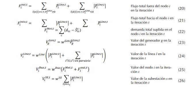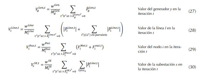 El vector solución que se obtiene como resultado del subproblema I-DC-OPF( ) sirve para construir una lista de componentes del sistema no atacados que se ordena respecto a su “atractividad” para las siguientes interdicciones. Para determinar la importancia (Valor) de cada uno de los componentes del sistema, (Salmeron, Wood, & Baldick, 2003) define las ecuaciones (20) a (26):