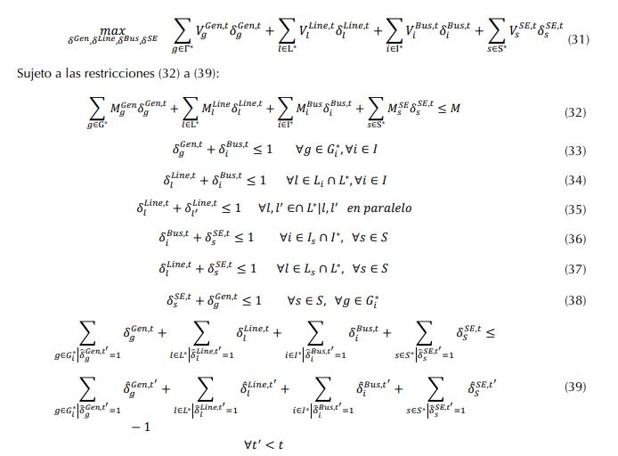 Como resultado del modelo de interdicción del punto anterior, se obtiene un vector de valores de todos los componentes del sistema . Con base en éste se plantea el problema principal de maximización de tipo binario {0,1} para la variable δ, cuya función objetivo es definida en la ecuación (31):