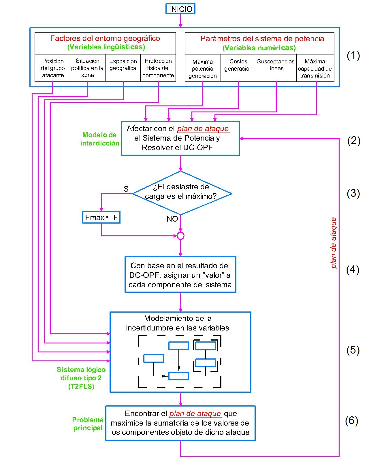 En el paso 2 se muestra el modelo de interdicción en el cual se resuelve el DC-OPF (Flujo de Potencia Óptimo DC) para el sistema de potencia. Dicho DC-OPF se lleva a cabo retirando del sistema los componentes afectados por el plan de ataque proveniente del Problema Principal (paso 6). En el paso 3 se evalúa si el deslastre de carga provocado por el plan de ataque es máximo, de ser así dicho plan de ataque sería el mejor para el atacante. En el paso 4 se asigna un valor a cada componente del sistema, dicho valor se basa en la cantidad de potencia que pasa a través del componente. En el paso 5 se lleva a cabo el modelado de la incertidumbre de los factores del entorno geográfico mediante Lógica Difusa Tipo 2. Por último, en el paso 6 se soluciona el Problema Principal en el cual se busca el plan de ataque de mayor valor.