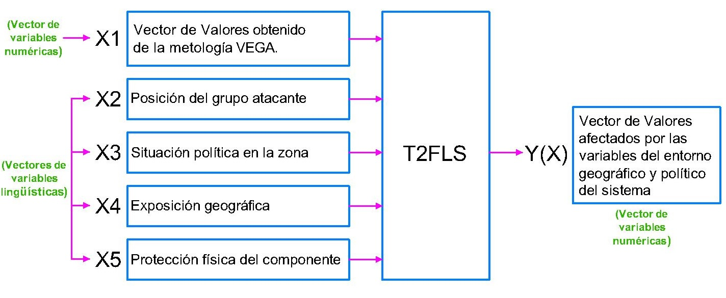 (19)En la Figura 4 se muestra el esquema del T2FLS que es propuesto para modelar los calificadores lingüísticos del entorno geográfico y político. La entrada X a este sistema se compone del Vector de Valores entregado por la metodología VEGA y de los calificadores lingüísticos del entorno geográfico, mientras que la salida Y(X) es el Vector de Valores con afectación del entorno geográfico y político.