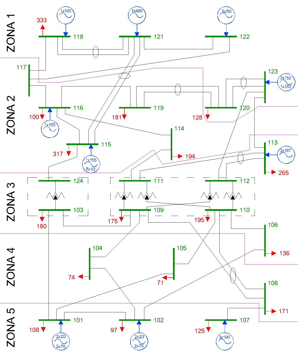 En la Tabla 3 se resumen los datos del sistema de potencia de prueba, mostrando la distribución de potencia generada, la potencia demandada, la cantidad de nodos del sistema y la cantidad de líneas de transmisión del sistema, por cada zona.