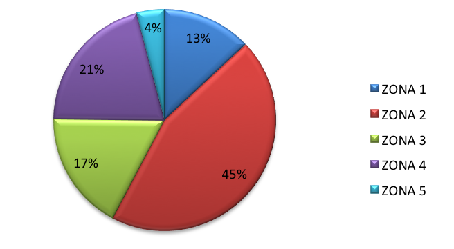 De igual forma, se puede establecer cuáles son las zonas más críticas del sistema. La figura 5 muestra la distribución de ataques en las distintas zonas del sistema para los 18 escenarios contemplados. Se observa que la zona a la cual van dirigidos la mayor cantidad de recursos de ataque es la zona 2 con un 45%. Una explicación de este fenómeno se debe a que la zona 2 es el punto intermedio entre la zona 1, que presenta la mayor potencia generada (52%), y la zona 3 que posee la mayor potencia demandada (33%). Otra explicación de este fenómeno es que la zona 2 posee la mayor cantidad de líneas de transmisión (Las cuales requieren de un (1) solo atacante para su interdicción), y dicha zona posee 12 líneas que corresponden al 32% del total de líneas