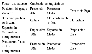 Predominio del grupo atacante: la presencia o predominio de un grupo atacante en un área determinada se entiende como el grado de influencia y control que éste ejerce. Se relaciona con el grado de poder que el grupo posee en dicha zona. Situación política en la zona: mediante los ataques terrorista, los grupos insurgentes buscan un impacto político para alcanzar sus objetivos de intimidación en la población civil. Exposición geográfica de los componentes: Dado que los sistemas de potencia abarcan regiones extensas en las cuales la mayoría de los componentes se encuentran en zonas apartadas, los componentes del sistema que se encuentran más expuestos geográficamente son más vulnerables a ataques.