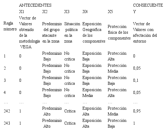El T2FLS propuesto para calcular el vector de valores afectado por el entorno Y(X) utiliza la base de reglas mostrada en la Tabla 2. Cada regla tiene cinco antecedentes y un consecuente (Para la regla i). La regla número 1 representa la condición menos atractiva para el atacante ya que el valor del componente es 0, el predominio del grupo atacante en la zona es bajo, la situación política en la zona no es crítica, el componente del sistema de potencia no está expuesto y la protección física del componente es alta. Por otro lado, la regla número 243 presenta la condición más atractiva para el atacante ya que el valor del componente es 1, el predominio del grupo atacante es alto, la situación política en la zona es crítica, el componente del sistema de potencia está expuesto y la protección física del componente es baja. El número de reglas es 35=243, ya que son cinco antecedentes, cada uno de los cuales tiene 3 estados. Se puede observar que el vector de valores con afectación del entorno Y, es una función de X1, X2, X3, X4 y X5. El T2FLS realiza un mapeo del espacio de entrada al espacio de salida utilizando la base de reglas de la Tabla 2 (La tabla completa se puede descargar de http://tinyurl.com/zmesusp).