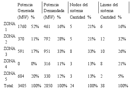 La tabla 3 muestra que la zona que presenta la mayor potencia generada es la Zona 1 con el 52% del total de la generación del sistema, siguen en su orden las zonas 5, 3 y 2 con el 20%, 17% y 11% respectivamente. En la zona 4 no existe generación. Se observa admás que la mayor potencia demandada se presenta en la Zona 3 con el 33% de la demanda total del sistema. Siguen en su orden las zonas 2, 1, 5 y 4 con el 28%, 16%, 12% y 11% respectivamente.