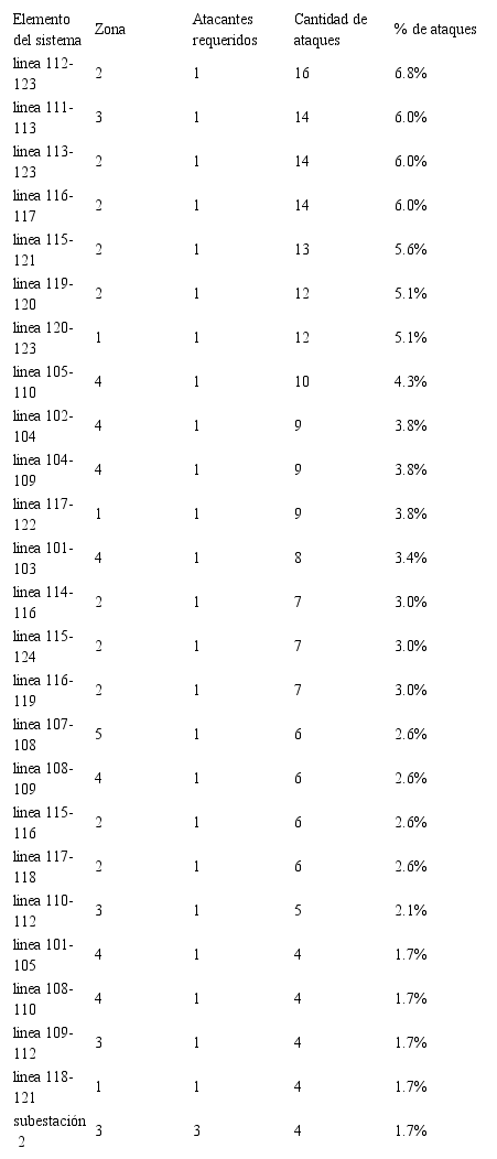 Por otra parte, la metodología propueta puede ser usada para determinar los elementos más críticos del sistema, independientemente del entorno geográfico de cada una de las zonas del sistema de potencia. Es decir, algunos calificadores linguisticos pueden variar con el tiempo, como por ejemplo, el predominio del grupo atacante en la zona puede variar, así como la situación política en la zona o la protección física de los componentes. Se puede entonces correr varios escenarios para establecer cuáles son los elementos que más presentan ataques sin importar la variación de los calificadores linguisticos. En la tabla 5 se muestra la cantidad de ataques en cada componente del sistema de potencia para el sistema de prueba usado, considerando 18 escenarios. Se observa que el elemento más atacado es la línea de transmisión que se encuentra entre los nodos 112 y 123. Esta línea es estratégica para el sistema ya que conecta un nodo con alta potencia generada y la subestación 2 que se encuentra en la zona 3. Los siguientes elementos en importancia son las líneas 111-113, 113-123, y 116-117. De esta forma, se puede planear mayor protección para estos elementos identificados como críticos en por recibir más ataques en los escenarios estudiados.