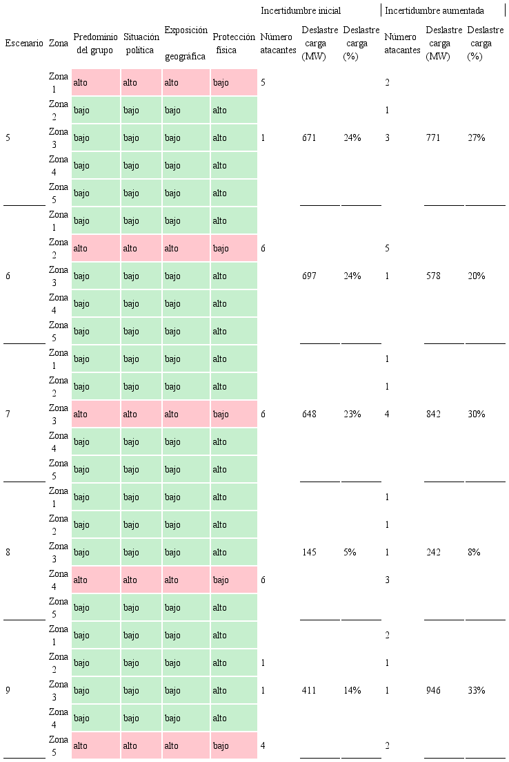 En la tabla 4 se muestran los resultados de 4 escenarios iniciales propuestos para probar la metodología, junto con los resultados de originales de la metodología VEGA. Entre la información mostrada en las tablas se encuentra el número de atacantes en cada zona resultado de la aplicación de la metodología, así como el deslastre de carga en MW y en valor porcentual. En primer lugar se presenta el resultado correspondiente a la metodología VEGA el cual no contempla la influencia de factores del entorno geográfico, es decir, el predominio del grupo, la situación política, la exposición geográfica y la protección física de los componentes del sistema. Cuando un calificador lingüístico es mostrado con color verde significa que es la condición menos atractiva para el atacante, dado que los calificadores lingüísticos del entorno (predominio del grupo atacante, situación política en la zona y exposición geográfica del componente) son bajos y la protección física de los componentes es alta. Por otro lado, cuando un calificador lingüístico es mostrado con color rojo significa que es la condición más atractiva para el atacante dado que los calificadores lingüísticos del entorno son altos y la protección física de los componentes es baja. El color amarillo representa el valor medio entre los dos anteriores.