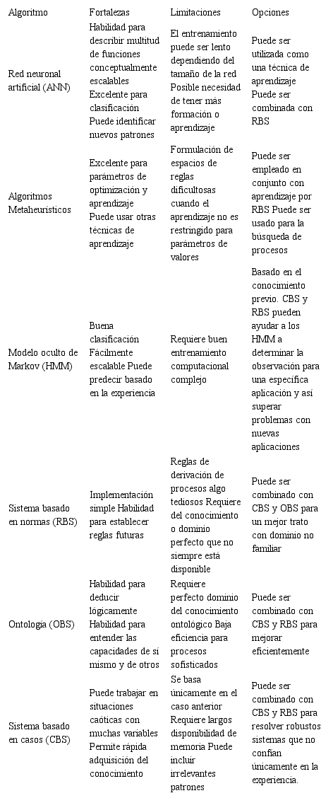 Las técnicas de inteligencia artificial son el núcleo de la mayor parte de los procesos de la CR. Por tal razón, en los siguientes apartados se presenta un resumen de las técnicas más favorables y cuyo análisis se centra en el aprovechamiento óptimo del espectro para comunicaciones. La tabla 1 describe las ventajas y desafíos de cada técnica.