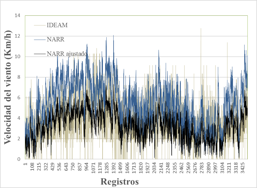 La Figura 1 presenta, a manera de ilustración, las series de tiempo tri-horarias de los datos tomados de NARR y los del IDEAM, junto con los NARR ajustados de acuerdo al modelo obtenido para la velocidad del viento en Barranquilla, Colombia.