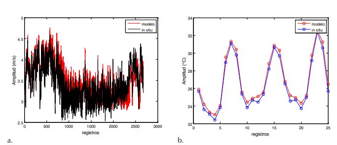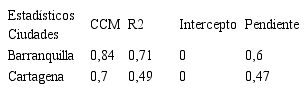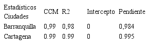Las Tablas 1 y 2, presentan el ajuste de los datos NARR, junto con los de las estaciones climatológicas del IDEAM. Con base en los estadísticos de regresión para los datos de velocidad del viento y de temperatura de las ciudades de Barranquilla y Cartagena, se infirió que el ajuste era adecuado, y permitía establecer una interpolación para obtener la información trihoraria desde enero 01 de 1980 hasta diciembre 31 de 2014 de las series de tiempo bajo estudio.