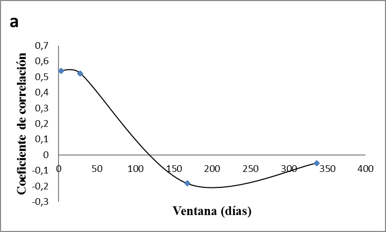 La escogencia del tamaño de la ventana se realizó basado en el coeficiente de correlación del modelo obtenido por ACP, en la Figura 2 se puede observar que a medida que se aumentó el tamaño de la ventana para los datos de temperatura y velocidadad del viento de Barranquilla y Cartagena respectivamente, el coeficiente de correlación se disminuyó significativamente.