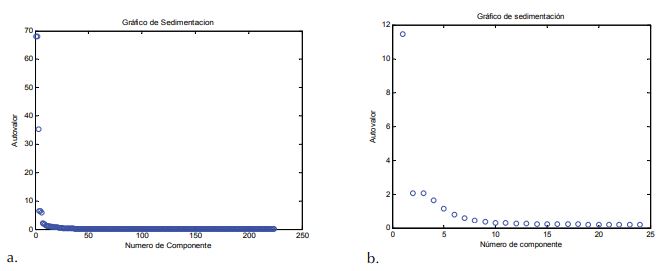 El gráfico de sedimentación en el cual se muestran los eigenvalores li, o autovalores, se presenta en la Figura 3 de aquí podemos observar que a partir de cierto número de componentes los autovalores permanecen constantes.