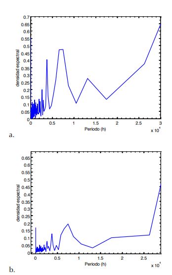 Inspeccionando los resultados de análisis espectral para temperatura ambiente en la ciudad de Cartagena, (Figura 6b) se identificaron ciclos de variabilidad de 24 horas, 109.5 días, 312.87 días, 2 años y 6 años. Estos ciclos de oscilación se asociación a la variabilidad natural del parámetro, donde el ciclo de 6 años este posiblemente relacionado con el Fenómeno del Niño.
