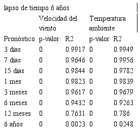 Los resultados de la prueba de sensibilidad del modelo de Fourier construido, indicaron que se puede modelar velocidad del viento y temperatura ambiente para la ciudad de Cartagena y Barranquilla hasta 6 meses según el coeficiente de determinación de 0.93 con p-valor significativo de 0 (Tabla 3).