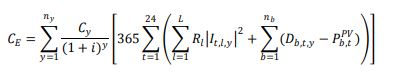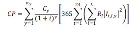 (1)En donde, y, t y l, son los subíndices asociados al año de análisis, la franja horaria y el corredor del sistema, respectivamente. L y ny son el número de corredores del sistema y la cantidad total de años, respectivamente. Además, Cy, i, Rl e It,l,y representan respectivamente, el costo de la energía en el año y, la inflación, la resistencia del tramo l y la corriente en el periodo t, el tramo l y el año y.