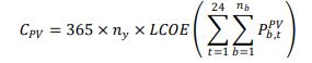 (2)En donde, nb es el número de nodos, Db,t,y es la demanda en el nodo b, franja t y año y, y Pb,tPV es la potencia inyectada por el panel en el nodo b y franja t. Con esta expresión se encuentra el VPN de los costos en los que se incurre por compra de energía. También se considera que el costo de la energía incrementa anualmente de acuerdo con proyecciones del mercado y las proyecciones de los precios de bolsa. La demanda a atender en cada nodo varía dependiendo de la cantidad de generación que se pueda atender localmente por medio de los PFV. De esta forma, se disminuye la energía transportada por la red y por tanto se reducen las necesidades de compra por parte del OR.