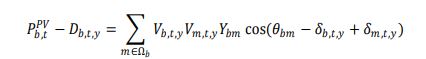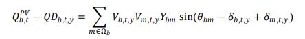 (10)Donde, Vb,t,y y δb,t,y son la tensión y el ángulo en el nodo b, en la franja horaria t y el año y; Ybm y θbm son la amplitud y el ángulo de la admitancia entre los nodos b y m; Qb,tPV es la potencia reactiva de soporte que puede inyectar el inversor asociado al panel instalado en el nodo b y la franja t; NGD es el número máximo de nodos permitidos para la instalación de PFV; β es el porcentaje de penetración del PFV instalado en cada nodo con respecto a la demanda máxima; Dbbase es la demanda máxima en el nodo b en el año base; Xb es una variable binaria que indica si en el nodo b existe instalación de PFV.