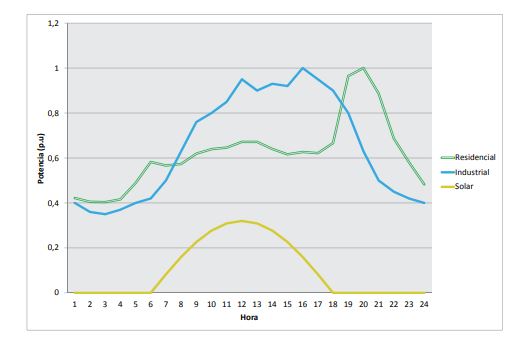 Para determinar el impacto de los PFV sobre el sistema de distribución, se toma el sistema de prueba de la IEEE de 37 nodos asumiendo cargas balanceadas (Garcés, Correa y Bolaños, 2014). Este alimentador tiene una carga total de 2.457 kW. Para dicho sistema se suponen nodos con cargas residenciales e industriales que siguen las curvas de carga normalizadas como se muestra en la figura 2.