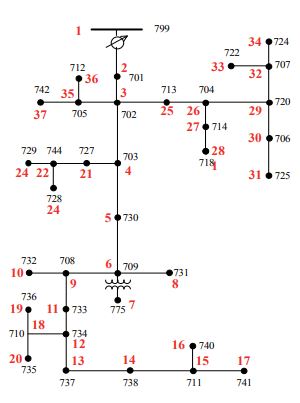 La carga industrial se encuentra ubicada en los nodos 25 a 34 y las demás cargas son del tipo residencial. El diagrama unifilar del alimentador del caso de estudio se muestra en la figura 3 con re-numeración de los nodos (en rojo) para facilidad en la presentación de los resultados.