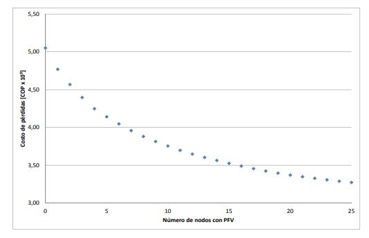 Para un escenario sin instalación de PFV los costos asociados a las pérdidas de energía son 5.050 millones de pesos colombianos. Cuando NGD aumenta, disminuyen a su vez las pérdidas, debido a la disminución de carga que se debe suplir desde la subestación de distribución y su consecuente impacto sobre las corrientes en el sistema. También influye el soporte de potencia reactiva local a través de los inversores de los PFV, utilizando para ello la ecuación (6). Para instalación de PFV en 25 nodos, se alcanza una disminución de 35,3 % en el costo asociado a las pérdidas.
