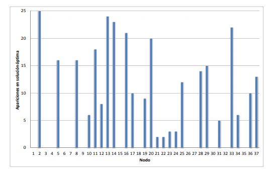 También es importante determinar los nodos más influyentes sobre la disminución de pérdidas. Para esto se muestra el número de veces que el algoritmo de optimización elige un nodo específico para instalación de PFV (del total de 37 nodos). De la figura 5 se observa que el nodo 2 estuvo presente para todas las simulaciones realizadas. De igual manera, los nodos 5, 7, 11, 13, 14, 16, 20, 25, 28, 29, 33 y 37 tienen presencia frecuente en las soluciones óptimas. Esto quiere decir que son los nodos más atractivos para la instalación de PFV con el fin de disminuir las pérdidas.