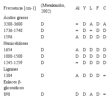 La espectroscopía infrarroja con transformada de Fourier (FTIR) permitió obtener los picos de absorbancia de interés para el estudio, que corresponden a las frecuencias de los grupos hidroxilos (-OH), carboxilos, carbonilos, lignina y enlaces β-glicosídicos, los cuales han sido reportados en el estudio realizado por Mwaikambo (2002). Las tendencias con el tratamiento alcalino deberían ser las siguientes: reducción de grupos OH de las hemicelulosas debido a la reacción con el NaOH, que se evidencia a longitudes entre 1.000 y 1.500 cm-1. Reducción de ácidos grasos por la disminución de los picos entre 3.200 y 3.600 cm-1. Reducción de trazas de ácidos grasos (grupo carboxílico) por disminución de pico entre 1.736 y 1.740 cm-1. Reducción de hemicelulosas por disminución del pico alrededor de 1.654 cm-1 (reducción de enlaces C=O). Reducción de ácidos grasos por disminución del pico en 1.596 cm-1. Reducción de ligninas y hemicelulosas debido a la disminución de los picos en 1.384 y entre 1.245 y 1.259 cm-1, respectivamente. Por último, la reducción de intensidad del pico en 898 cm-1, el cual indica la presencia de enlaces β-glicosídicos entre monosacáridos (azúcares simples). Al observar los resultados, tenemos que las fibras de fique, yute y coco presentan una mayor afinidad con los reactivos, seguidas del algodón y el lino. La poca variación entre los espectros infrarrojos de estos dos tipos de fibra puede presentarse como una evidencia de la influencia que tienen los tratamientos de estas fibras previos a su comercialización. El uso de ácidos, álcalis (como el NaOH), sales y agentes oxidantes son químicos de uso común para el descrude, blanqueo y teñido de fibras vegetales (Lockuán, 2012).