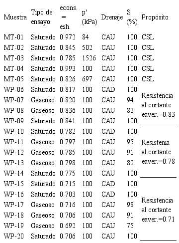 Las muestras, excepto aquellas utilizadas para la localización de la línea de estado crítico, fueron consolidadas anisotropicamente a esfuerzos efectivos promedio normales de 100 kPa (s’3c = 82 kPa, s’1c=136 kPa, and ko =0,6); esfuerzos que son representativos de las condiciones de esfuerzos del horizonte de arena suelta a la profundidad de muestreo (aproximadamente 10 m). Los ensayos triaxiales se dividieron en tres grupos para cuantificar la respuesta monotónica del suelo en función de la relación de vacíos y el grado de saturación. Tanto las relaciones de vacío usadas como los grados de saturación son representativos de las condiciones de la arena donde se realizó la densificación con explosivos. Las muestras preparadas por la técnica de compactación húmeda se usaron para definir la línea de estado crítico y para comparar los resultados obtenidos con las muestras preparadas con la técnica de sedimentación en agua. En la tabla 1 se presenta el número del ensayo, el tipo de ensayo (saturado o gaseoso), la relación de vacíos después de la consolidación, el esfuerzo efectivo medio normal después de la consolidación, las condiciones de carga (D: drenada o U: no drenada), el grado de saturación después de la carga y el propósito del ensayo.