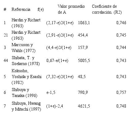 [2]Donde, = presión atmosférica (101,3 kPa); = función de relación de vacíos; y y constantes del material. La figura 5a compara los valores calculados de basándose en las expresiones previamente publicadas de las mediciones de los valores de durante consolidación. Como se puede observar, los valores medidos de se encuentran dentro de las funciones de relación de vacíos propuestas por varios autores. La tabla 2 reúne las funciones de relación de vacíos, el promedio del valor A y el coeficiente de determinación (R2) obtenido para siete (7) expresiones diferentes. Como se observa, el coeficiente de determinación varía muy poco entre las expresiones empíricas presentadas; por tanto, se escogió la función propuesta por Hardin y Richart (1963) para los cálculos realizados en este trabajo, considerando principalmente que esta expresión fue desarrollada para suelos granulares. Igualmente, la figura 5b compara los resultados medidos por medio de los elementos bender durante el proceso de consolidación con aquellos calculados por Hardin y Richart (1963). La expresión final obtenida para el módulo elástico de corte normalizado es: