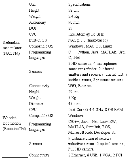 This global navigation method is implemented for an assistant robot composed by NAOTM and FESTO RobotinoTM robotic platforms for redundant manipulation and locomotion (Muñoz Martinez, Gil-Gómez & Garcia Cerezo, n.d.; Zambrano Pérez, 2015), respectively, as it is shown in Figure 1. Its specifications are detailed in Table 1. That navigation is based on external sensing and control; it uses a panoramic IP camera, a computer, and the assistant robot. The complete diagram block of the system is shown in Figure 2. The panoramic IP camera is placed in the middle of the scene, two and a half meters from the floor. The process has four main steps: image acquisition and pre-processing, object detection, path-planning algorithm, and locomotion performance, each one is described in detail below.