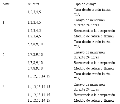 Se organizaron los bloques en el horno por niveles; para tomar las muestras se utilizó el muestreo por estratos indicado la Tabla 1, se dividió el área del horno en 3 niveles de manera que cada uno sea claramente diferenciable con el objetivo de tomar las muestras y que estas representen el conjunto o nivel del cual provienen (Alfaro, 2002); de cada nivel se seleccionaron 20 muestras y se utilizaron cinco para cada ensayo (Instituto Colombiano de Normas Técnicas NTC 4017, 2005).