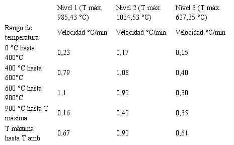 En el segundo nivel se presenta una temperatura de cocción que supera los 1000 °C, y se encuentra para la muestras ubicadas en este nivel el mayor módulo de rotura o resistencia a la flexión con un valor de 1,54 MPa, lo que concuerda con la teoría, dado que las piezas cocidas por debajo de los 1000 °C presentan menor módulo de rotura (Peña, Miranda y Santafe, 2009). La velocidad de incremento de temperatura en el tercer nivel es la más baja y en este nivel la temperatura máxima es la menor de los tres solo alcanza los 627,35 °C, lo que permite alcanzar la mayor tasa de absorción inicial de 0,37 g/cm2/min y la mejor resistencia a la compresión de 7,28 Mpa, dado que a bajas velocidades de calentamiento se mejoran las propiedades al disminuir la temperatura máxima de cocción (Fernández, 2000).