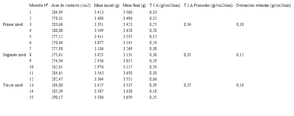 En la tabla 2 se presentan los resultados para la absorción inicial de agua TIA de acuerdo con el procedimiento descrito en la metodología.