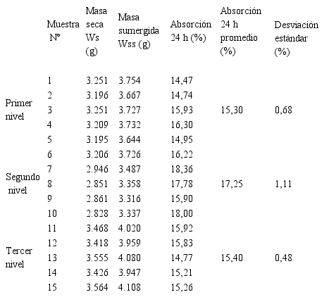 La técnica usada permite determinar la absorción de agua final al término de 24 horas, las muestras ubicadas en el nivel 2 del horno son las que presentan mayor tasa de absorción con un porcentaje del 17,25 %, entre el nivel 1 y el nivel 3 los valores son similares 15,30 % y 15,40 %, respectivamente.