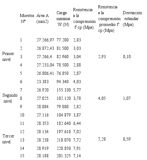 El ensayo de compresión se realizó de acuerdo con la norma técnica colombiana NTC 4017 a las 5 muestras seleccionadas de cada nivel del horno, las cuales se secaron durante 24 horas en un horno marca Pinzuar, a temperatura entre 110 °C y 115 °C, luego se enfriaron a 24 °C ± 8 °C, con valores de humedad del 30 al 70 % por 4 horas, posteriormente se refrentaron con yeso aplicado en cada cara con un espesor máximo de 3 mm, finalmente se llevaron las muestras a una universal marca Pinzuar modelo PV-100-600 serie 109 de 1000 KN, y se aplicó carga en el área de contacto hasta llevarlas a la falla.