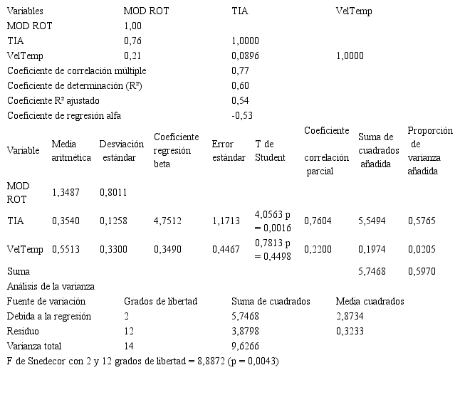 (5)Se consideró la velocidad de incremento de temperatura, la tasa de absorción inicial TIA y los resultados de la inmersión a las 24 horas como variables independientes y la resistencia a la compresión y el módulo de rotura como variables dependientes. Del análisis de la regresión lineal múltiple se encontró que la velocidad a la que se incrementa la temperatura tiene un coeficiente de correlación negativo de 0,22 con respecto a la resistencia a la compresión y positivo de 0,21 con respecto al módulo de rotura, se destaca también que la tasa de absorción al término de las 24 horas presenta un coeficiente de correlación positivo de 0,34 con el módulo de rotura. En la tabla 6, se muestra la relación encontrada entre la tasa de absorción inicial (TIA) con coeficiente de correlación positivo de 0,76 con el módulo de rotura y con un coeficiente de correlación múltiple de 0,77 para la TIA y la velocidad sobre el MR.