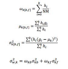 In this work, the segmentation of textures was developed with the Otsu threshold method and Gabor filters. The following are the basic steps for the implemented Otsu algorithm: the mosaic image histogram is computed using L gray levels; for each gray level, the equations (2) to (5) help to compute the weight, mean and variance of the background and foreground, and the within class.