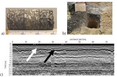 Figure 1. a) Example of pavement core (Sanchez et al., 2008). b) Digging hole (Sanchez et al., 2008)s. c) Typical GPR output (Hugenschmidt & Fürholz, 2012).