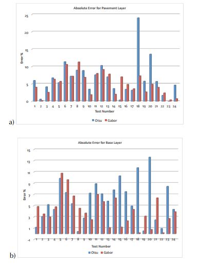 Figures 9a and 9b show the absolute errors for the pavement and base layers. Both figures consider the Otsu (sloping lines) and Gabor filter (horizontal lines) methods. In average, the results show an error of pavement layer thickness estimation of 6.405% ±5.03, and 5.07% ±3 for the Otsu and Gabor filter, respectively; an error of base layer thickness estimation of 5.88% ±3.5, and 4.13% ±2.7 for the Otsu and Gabor filter, respectively. The less the better, so Gabor filters outperforms the Otsu method. However, both methods are prone to errors when illumination changes; even though, Gabor filters were found more robust since they are able to be tuned using different orientations, time and space wavelengths. The Otsu method performed surprisingly well; an explanation of this behaviour could be that it resolves the segmentation problem globally. Another reason why the Gabor filter outperforms the Otsu method is that the latter uses brute force to compute the best threshold, without considering the local relationship in the image textures. On the contrary, the Gabor filter considers not only the local morphology in the image texture, but also their relationship in the frequency domain.