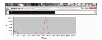 Each image is joined with the next one to build a mosaic of 1321x160 pixels, and it is converted to gray scale (an example of this kind of image is shown in Figure 3). Most pavement-layers images are very noisy with high frequency components present, so a mean filter (with a slip window 5x20 pixels) is used on the mosaic image to smooth its appearance.