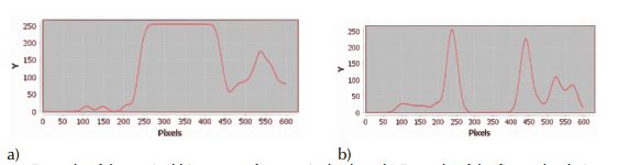Henceforth, the vertical histogram of mean pixel values is computed to obtain the resulting images from both segmentation methods (Otsu and Gabor filter). It results in a 1D signal where peaks or inflection points are putative locations of pavement layers interfaces (Figure 6a). In order to identify the location of these interfaces of pavement layers, a first-order derivate is taken of the vertical histogram of mean pixel values. Afterwards, the peak values of this signal show the position of the interfaces (shown in Figure 6b). The position of the interfaces of pavement layer is given in pixels. Finally, to transform this information to metric values, the motion step given in equation (1) and the pixel to distance ratio were used to finally estimate the thickness of the pavement layers.